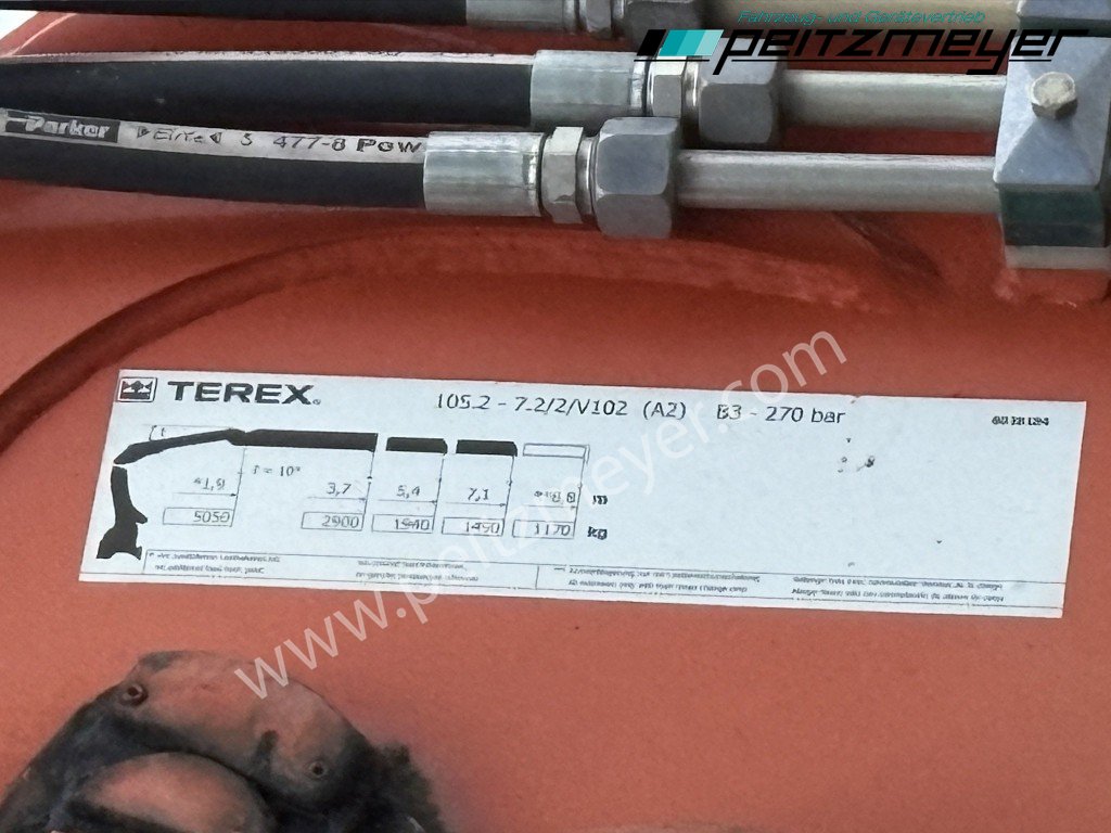 Aufbautyp: Ladekran Terex 105.2 - A 2, Baujahr 2008, wenig genutzt - nur 1.270 Betriebsstunden, Lastdiagramm 3,7 m - 2.900 kg, 5,4 m - 1.540 kg, 7,1 m 1.450 kg, Hochstandsteuerung, Drehservo, Lasthaken, Dreiseitenkipper L x B x H 4.600 x 2.470 x 980 mm, Stahlboden mit Zurrösen im Boden, Alubordwände