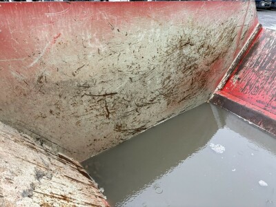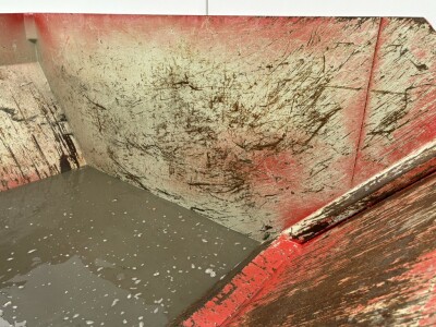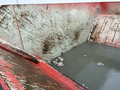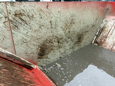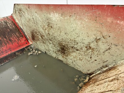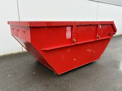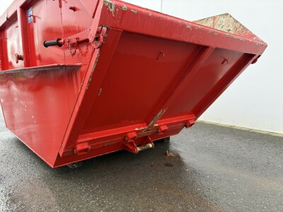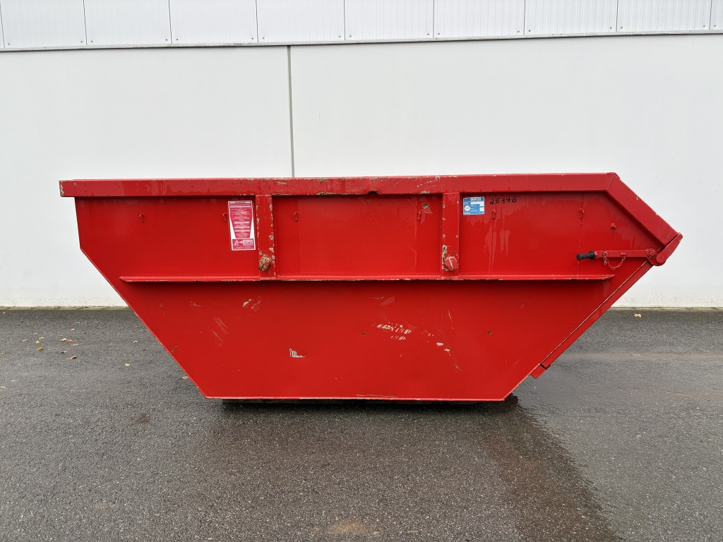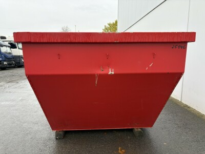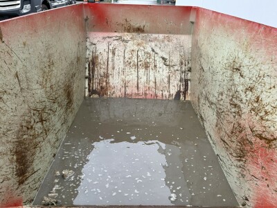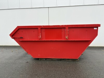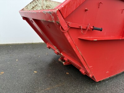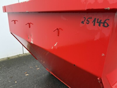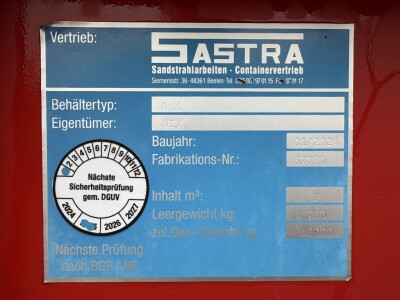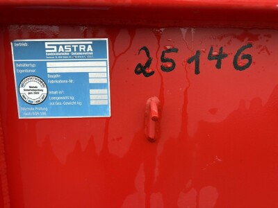 Aufbautyp: Absetzmulde Sastra - AMK, Inhalt: ca. 7 m³, Asymmetrische Form mit Einfach-Kipplager an der Schüttkante, Aufnahmebeschläge für Absetzsystem nach DIN 30720, Boden 6 mm, Seiten 4 mm, alle Ecken verstärkt, Netz- und Planhaken umlaufend, mehrfach vorhanden - auch ohne Klappe