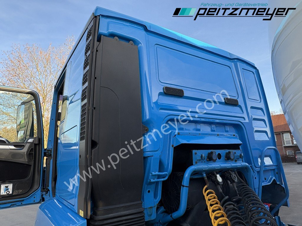 Differentialsperre Hinterachse, Hinterachse luftgefedert, Fahrerhaus L (lang), Fahrerhaus mit niedrigem Dach, elektr. Fensterheber Fahrer- und Beifahrerseite, ZF - Intarder, Radio mit CD, Klimaautomatik, Heizung für Fahrersitz, Liege unten, Tempomat, Standheizung, Aerodynamische Seitenverkleidungen, Dachluke/Lüftungsklappe Dach, Rückspiegel heizbar u. elektrisch verstellbar, Zentralverriegelung, Elektrik, Gefahrenklasse 3 A, ADR/GGVS - Ausführung, Sonnenblende außen, Alufelgen 9.00x22.5 Alcoa Dura Bright, Diff.-Sperre Hinterachse, HINTERACHSE LUFTGEFEDERT, Abgasnorm Euro 5, Umweltplakette: 4(Grün), Automatikgetriebe, Grundfarbe: blau, Diesel, Schadstoffklasse: Euro5, Hinterachsenantrieb, Klimaanlage