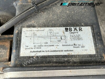 Aufbautyp: 3 Achs Kofferanhänger L x B x H 8.200 x 2.470 x 2.140 mm, Ladebordwand BÄR BC 1.500 S 4, Alublatt 1.600 mm, 3 reihen Zurrleisten rechts und links, 6 reihen Zurrleisten im Boden und Dach, Mercedes Benz Achsen luftgefedert mit heben und senken, mittlere Achse liftbar, ABS, Elektrik 24 V - 15 polig, Luftanschluß Duomatik, Zugdeichsel mit Öse 40 mm