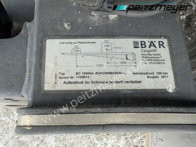 Aufbautyp: 3 Achs Kofferanhänger L x B x H 8.080 x 2.500 x 2.146 mm, Ladebordwand BÄR BC 1.500 S 4, Alublatt 1.600 mm, 3 reihen Zurrleisten rechts und links, 8 reihen Zurrleisten im Boden und Dach, Mercedes Benz Achsen luftgefedert mit heben und senken, ABS, Elektrik 24 V - 15 polig, Luftanschluß Duomatik, Zugdeichsel mit Öse 40 mm