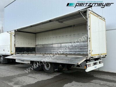 Aufbautyp: Getränke - Schwenkwandanhänger - Überdach Fa. Ewers, Meschede L x B x H 7.720 x 2.460 x 2.270 mm, Heckportaltüren, Ladegutzertifikat VDI 2700, tiefgekuppelt, BPW - Achsen luftgefedert mit heben und senken, Scheibenbremse, 15 pol. Stecker, ABS, Duomatikanschluß, weiss neutral - ohne Beschriftung